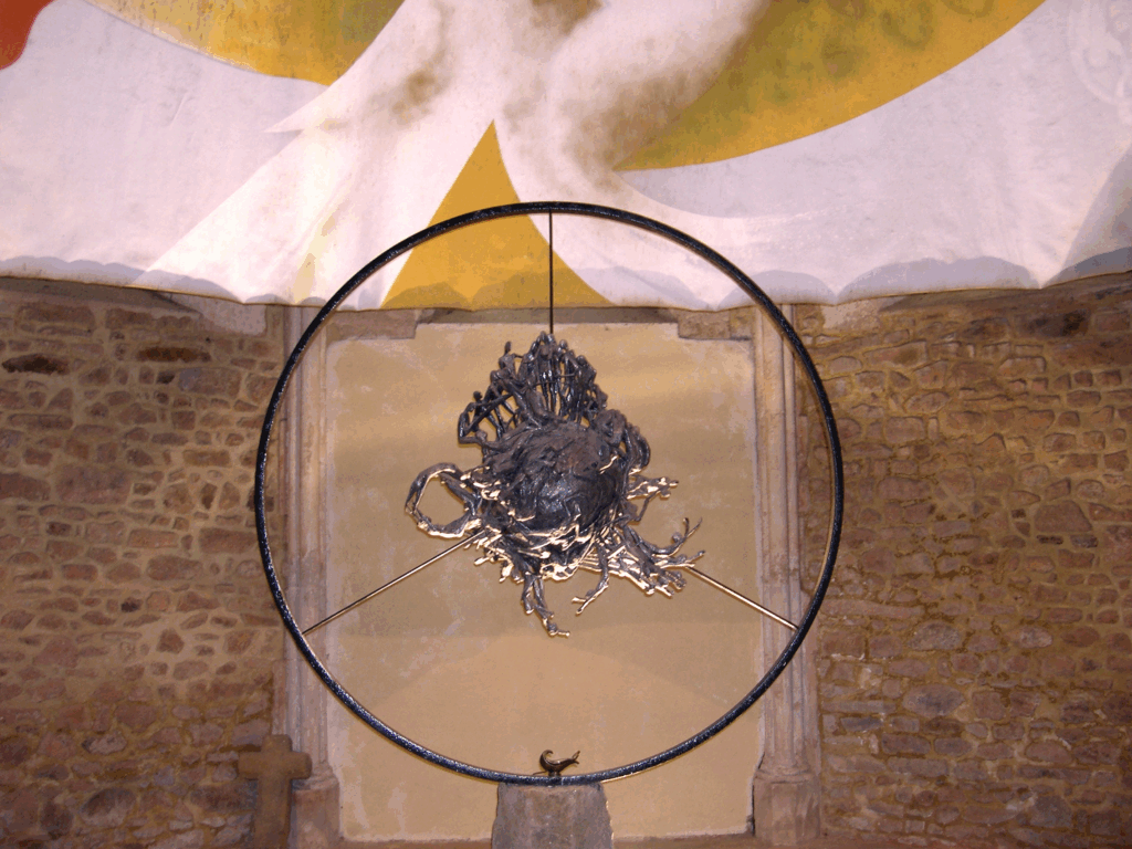2° – Le tabernacle de Christian MALEZIEUX : une sphère de métal fondu pour exprimer ce qu’il nomme : « La terre – mère »- l’expression d’un temps de violence et de mort, mais aussi d’amour et de sagesse….Un ensemble pétri de mythes et de chants sacrés – Un mélange de divin et d’humanisme troublant.